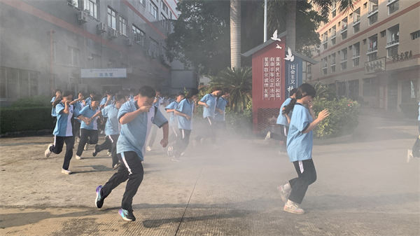 下午3時,消防警報劃破長空,橙色煙霧模擬火場環(huán)境迅速彌漫樓道。在軍訓(xùn)教官和學(xué)工處老師的聯(lián)合組織下,同學(xué)們迅速用濕毛巾捂住口鼻,低姿彎腰沿墻前行,按照預(yù)定疏散路線快速向開闊地帶轉(zhuǎn)移。整個過程中,同學(xué)們沉著冷靜、動作規(guī)范,快速有序疏散,安全抵達集結(jié)區(qū)域,展現(xiàn)出良好的紀律意識和協(xié)作能力。