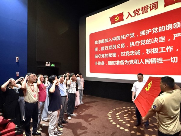 觀影結(jié)束后,在肅穆的氛圍中,黨支部書記潘向東同志帶領(lǐng)全體黨員,面向鮮紅的黨旗,重溫入黨誓詞?!拔抑驹讣尤胫袊伯a(chǎn)黨……” 鏗鏘有力的誓言在影廳內(nèi)回蕩。黨員們緊握右拳,目光堅(jiān)毅,字字千鈞的承諾,不僅是對入黨初心的深情回溯,更是對“為黨育人、為國育才”神圣使命的鄭重宣示。這一刻,教育工作者肩頭的責(zé)任與擔(dān)當(dāng),在黨性的淬煉中愈發(fā)清晰而堅(jiān)定。