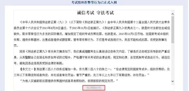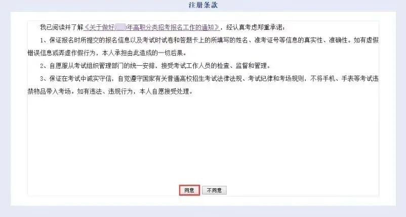 閱讀《考試組織作弊等行為已正式入刑》10秒后,點擊“我已閱讀”按鈕,圖見步驟一,跳轉(zhuǎn)到注冊條款頁面,閱讀通知文件,10秒后,點擊“同意”按鈕,跳轉(zhuǎn)到注冊頁面;若您點擊“不同意”按鈕,則跳轉(zhuǎn)到初始登錄界面,圖見步驟二。
