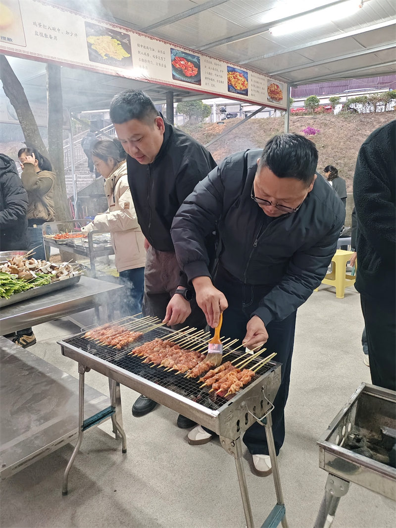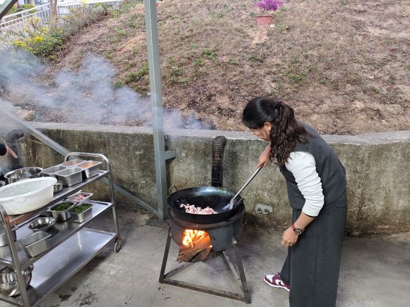 日影西斜,炊煙裊裊升起。各小組分工協(xié)作,有的生火備料,有的掌勺烹調(diào)。燒烤架上滋滋作響,大鍋灶里熱氣蒸騰,老師們在鍋碗瓢盆的協(xié)奏中交流廚藝、分享心得,尋常食材在協(xié)作中化作美味佳肴。