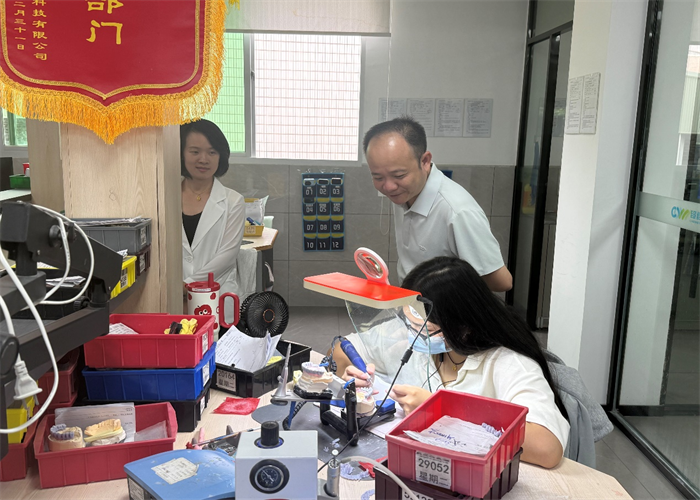 在企業(yè)負(fù)責(zé)人陪同下,杜成達(dá)校長一行首先參觀了超維醫(yī)療科技有限公司的生產(chǎn)車間。在工作人員的引導(dǎo)下,校領(lǐng)導(dǎo)詳細(xì)了解了口腔義齒從原材料處理、數(shù)字化設(shè)計(jì)、3D打印成型到精細(xì)打磨、質(zhì)檢包裝的完整生產(chǎn)流程,并實(shí)地察看了先進(jìn)的生產(chǎn)設(shè)備與嚴(yán)格的質(zhì)量控制體系,對企業(yè)的專業(yè)化、規(guī)范化管理給予高度評價(jià)。