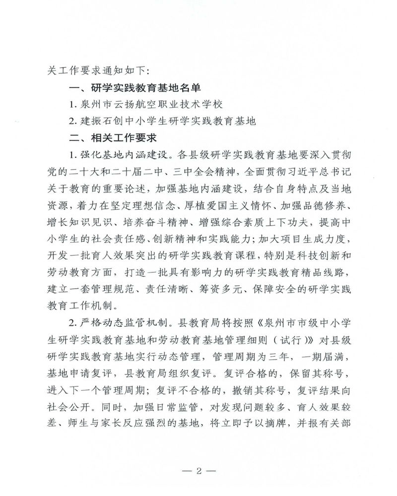 2025年9月30日,惠安縣教育局發(fā)布了《關(guān)于公布惠安縣2025年中小學(xué)生研學(xué)實(shí)踐教育基地名單的通知》,其中,我校云揚(yáng)航空科學(xué)館被認(rèn)定為“惠安縣中小學(xué)生研學(xué)實(shí)踐教育基地”。