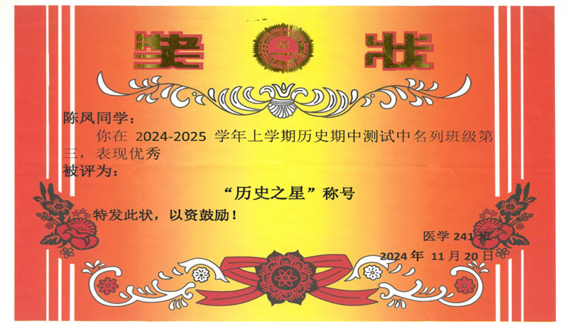 品學(xué)兼優(yōu),筑基未來:連續(xù)兩年專業(yè)成績名列前茅,榮獲2024-2025學(xué)年“三好學(xué)生”稱號(hào),她以扎實(shí)的專業(yè)知識(shí),為未來的從醫(yī)之路奠定了堅(jiān)實(shí)基礎(chǔ)。