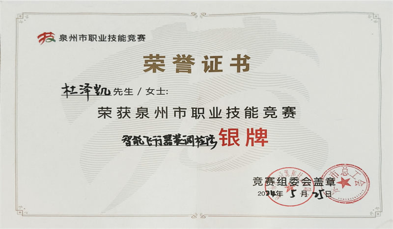 賽場爭鋒,技?jí)喝盒郏涸?024年泉州市職業(yè)技能競賽中,憑借過硬的專業(yè)能力斬獲“智能飛行器裝調(diào)檢修”項(xiàng)目銀牌,讓技能之光閃耀賽場。